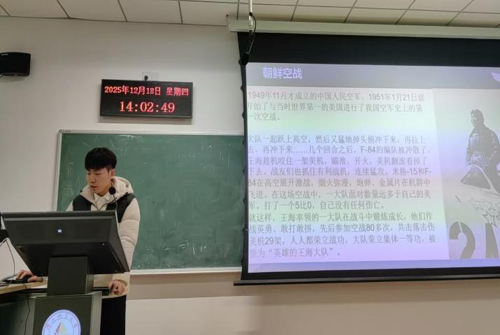 12月18日,系列活动收官之讲“军旅精神的当代践行”如期举行。行政管理专接本杜金桐同学,原服役于中国人民解放军空军总参谋部直属单位,将军旅文化与青年责任担当深度融合,通过“红色故事分享会”“爱国行动倡议”两大板块传递实践理念。通过学习空军历史(抗美援朝空中作战、国产战机发展历程)、英雄事迹(如王海、杜凤瑞、王伟等战斗英雄),抢险救灾(地震救援、空中投送物资),向同学们传承了“空中拼刺刀”的精神,筑牢“为祖国而飞”的信念。