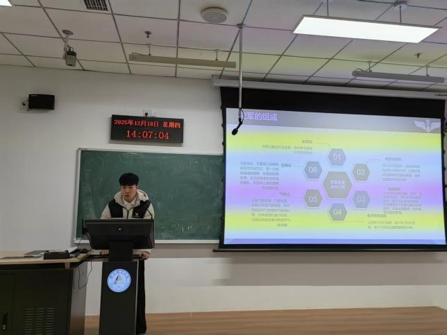 11月13日,由行政管理专接本学生骆明轩以“军旅文化中的精神密码”为主题,通过精心制作的课件系统梳理我国军旅文化发展脉络。骆明轩曾服役于中国人民解放军中部战区陆军第82集团军某旅,被表彰为“四有”优秀士兵并记战备训练嘉奖1次。结合鸦片战争至新时代国防建设的关键历史节点,重点解读了“狼牙山五壮士”“两弹一星”研制团队等英雄群体的爱国事迹,同步展示不同时期的军装、勋章复刻品与历史文献影像,让在场学生直观感受军旅文化的精神内核。